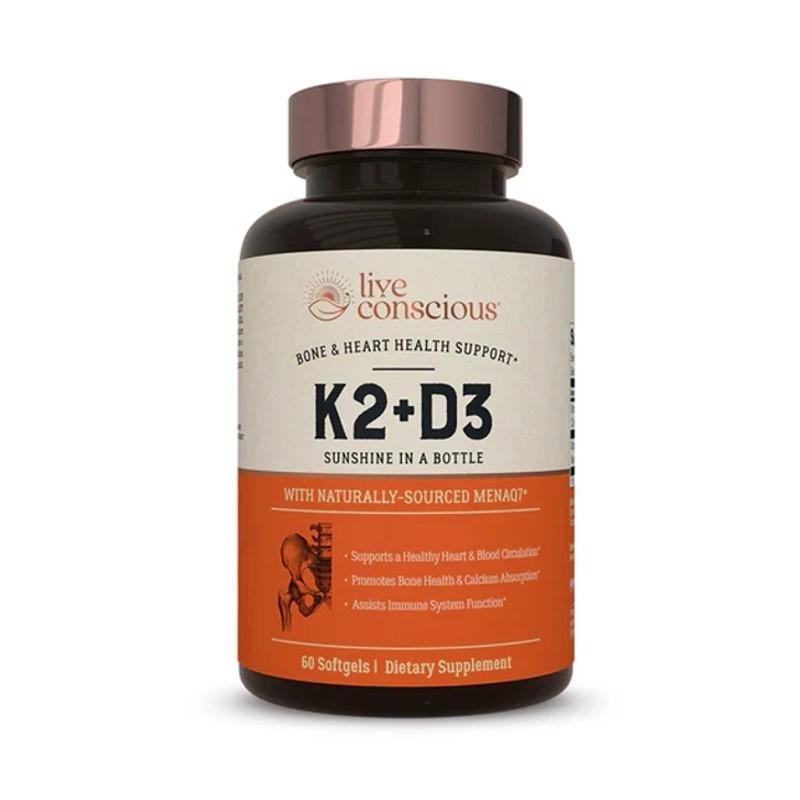 Live Conscious® K2 + D3 combines two essential vitamins—Vitamin D3, the “sunshine vitamin,” and Vitamin K2 (as MenaQ7®)—to provide comprehensive support forbone strength, cardiovascular health, and immune system balance. Together, these nutrients help your body properly utilize calcium, promoting strong bones and a healthy heart.