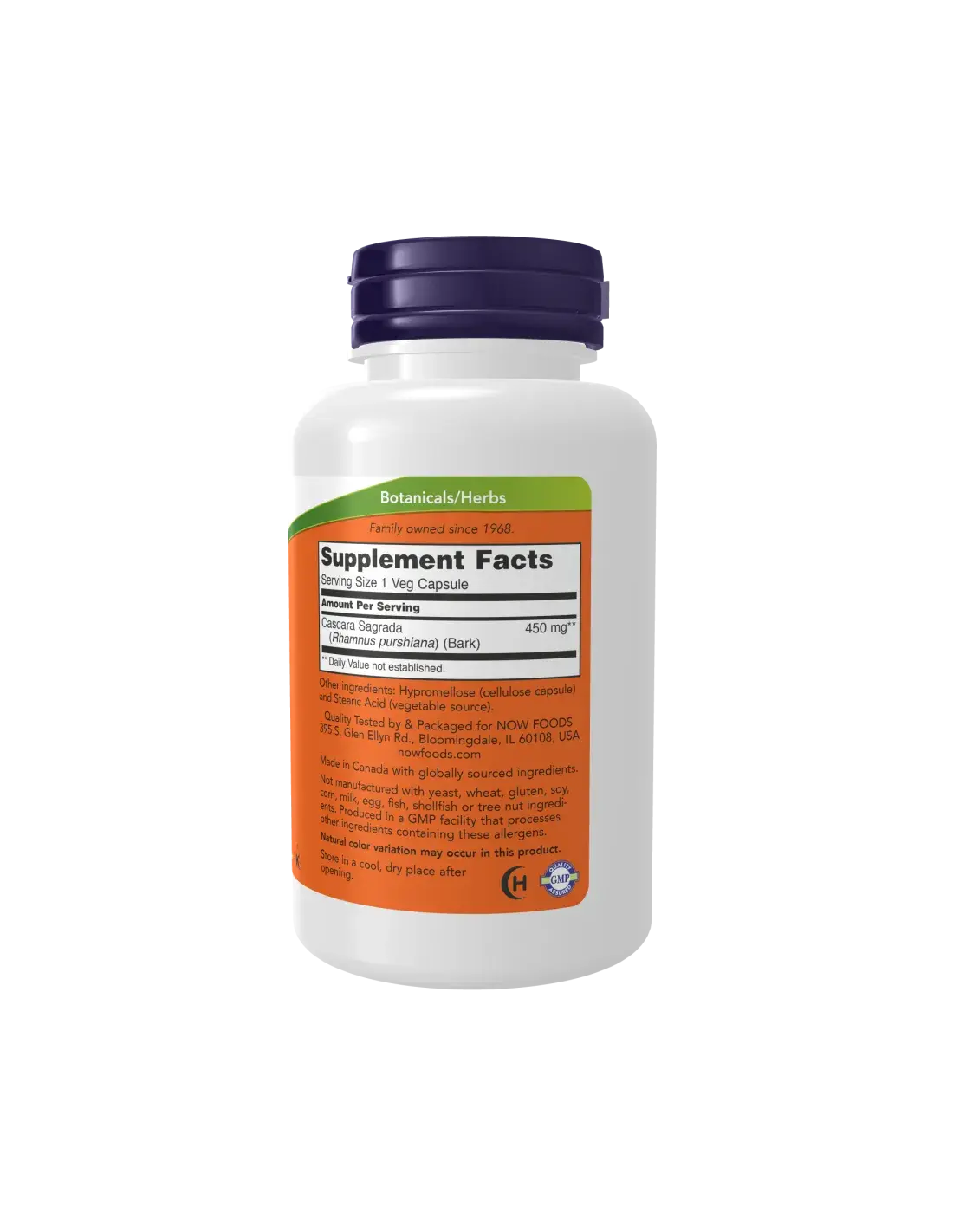 - Cascara Sagrada Bark (Rhamnus purshiana)—450 mg per capsule