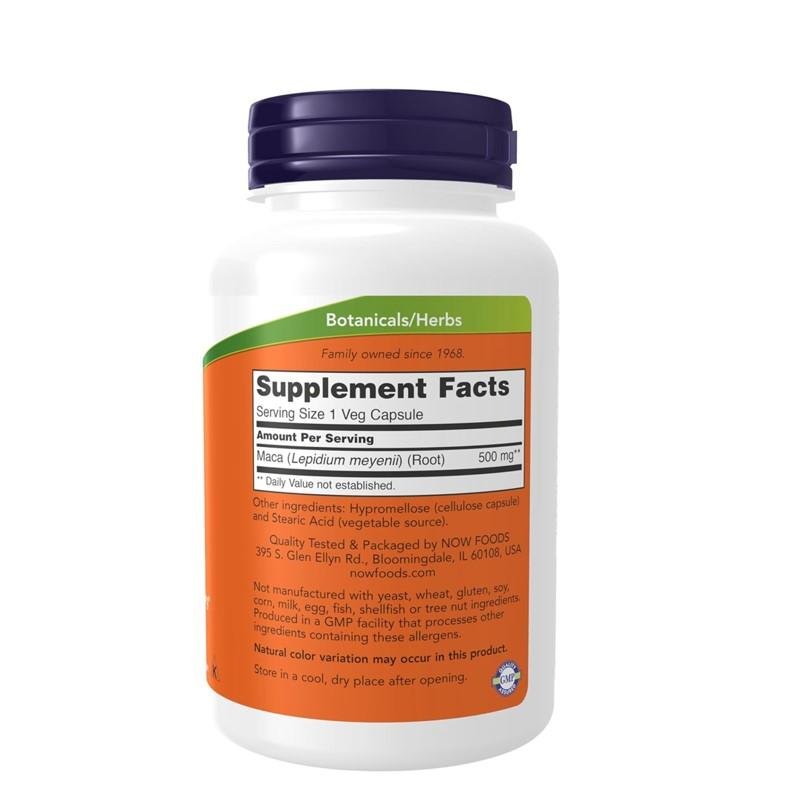 NOW Foods Maca 500 mg is a natural dietary supplement derived from the root of the Lepidium meyenii plant, traditionally grown in the high Andes of Peru.
