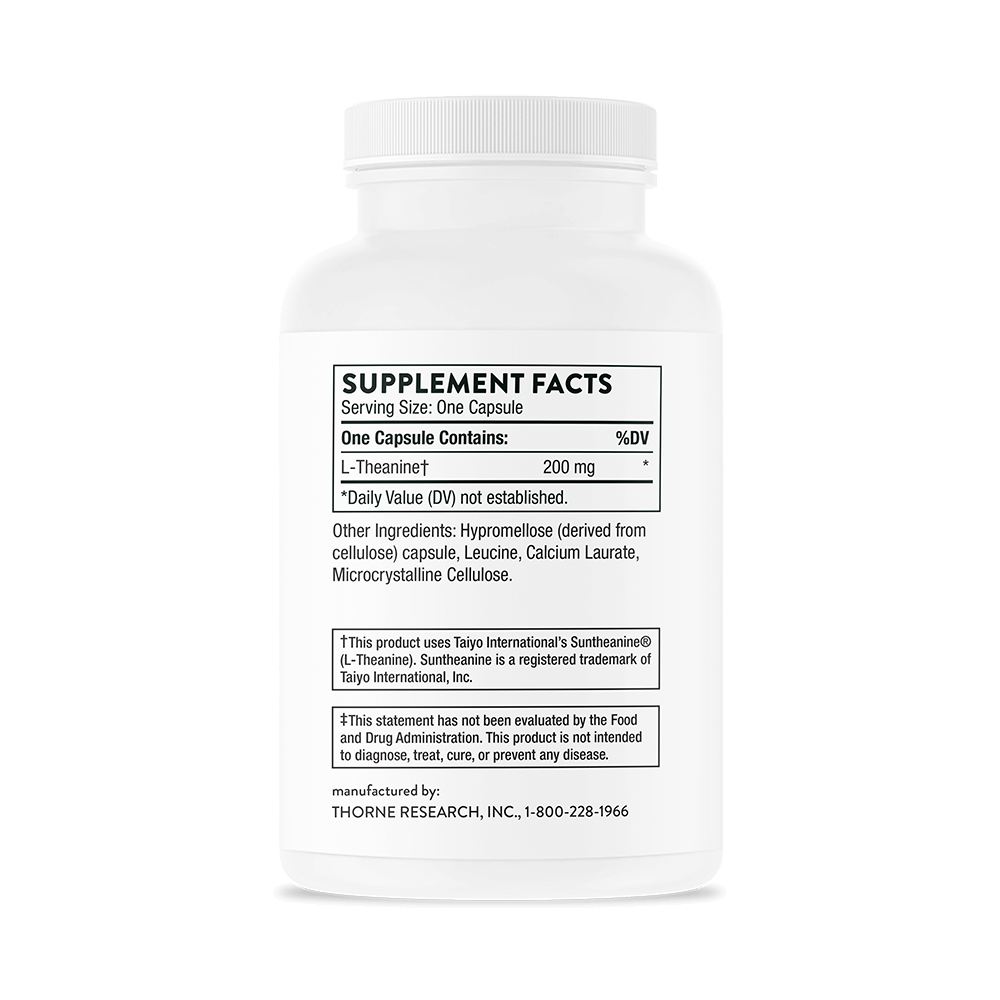 Thorne Theanine provides 200 mg of pure L-theanine per capsule, an amino acid naturally found in green tea. L-theanine is known for its ability to promote relaxation without drowsiness, support mental focus, and help the body maintain a balanced stress response. Unlike sedatives, it works by modulating neurotransmitters such as GABA, dopamine, and serotonin, encouraging calm alertness while still supporting cognitive performance.
