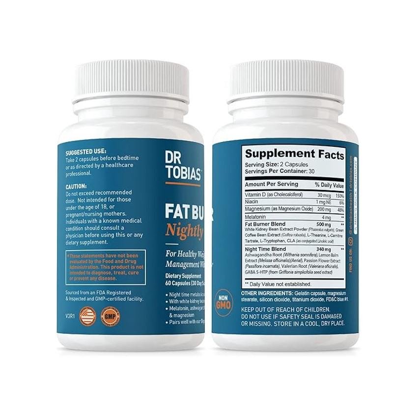Dr. Tobias Fat Burner Nightly is a unique nighttime weight management formula designed to support your metabolism, relaxation, and fat-burning processes while you sleep. Unlike harsh stimulants, it uses natural ingredients that work in synergy to encourage calorie burning, appetite control, and restful sleep, making it easier to reach your weight management goals.