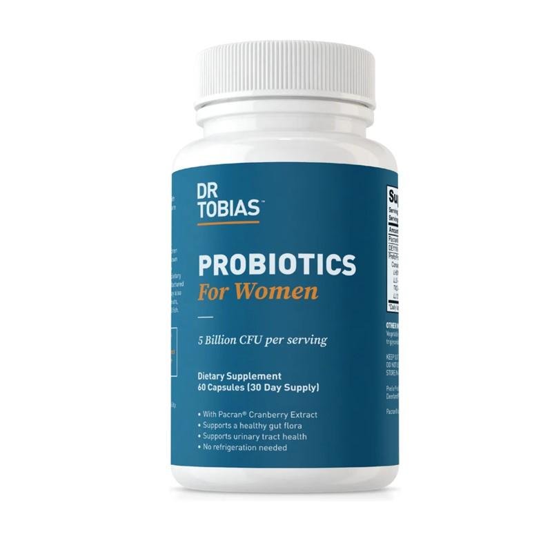 Dr. Tobias Probiotics for Women is a specialized probiotic formula delivering 5 billion CFU per serving combined with cranberry extract, designed to support women’s digestive, immune, and urinary tract health. The unique combination helps restore beneficial gut bacteria, while cranberry extract is well known for its ability to promote urinary tract wellness.