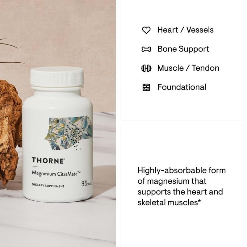 Thorne Magnesium CitraMate™ combines two well-absorbed forms of magnesium—magnesium citrate and magnesium malate — to provide optimal support for muscle function, energy production, heart health, and relaxation.