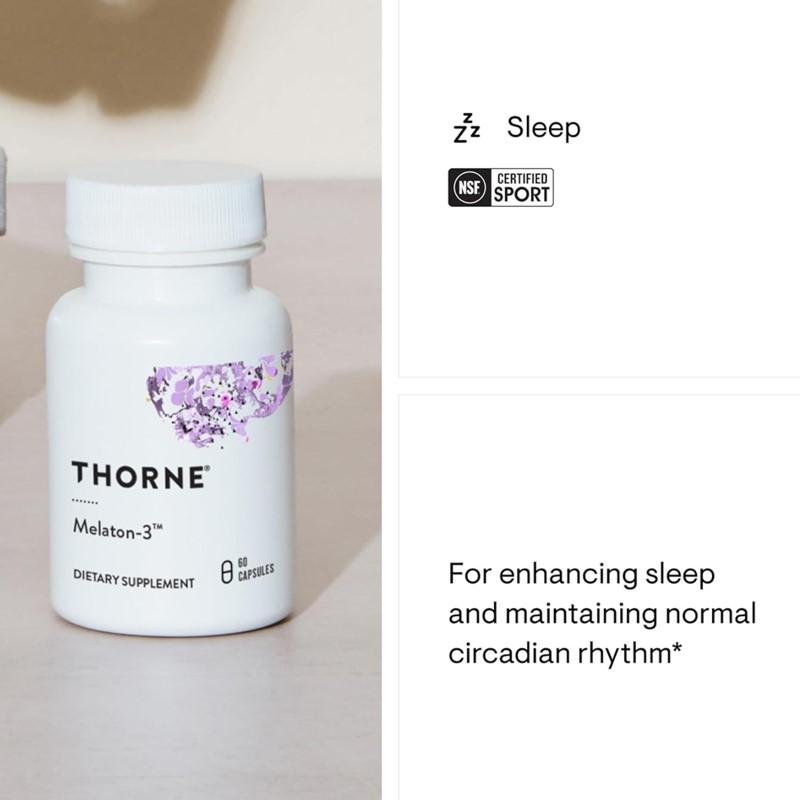 Thorne Melaton-3™ provides a natural and effective way to support healthy sleep cycles, relaxation, and antioxidant protection. Each capsule delivers 3 mg of pure melatonin, a hormone naturally produced by the pineal gland that regulates the body’s circadian rhythm (sleep–wake cycle).
